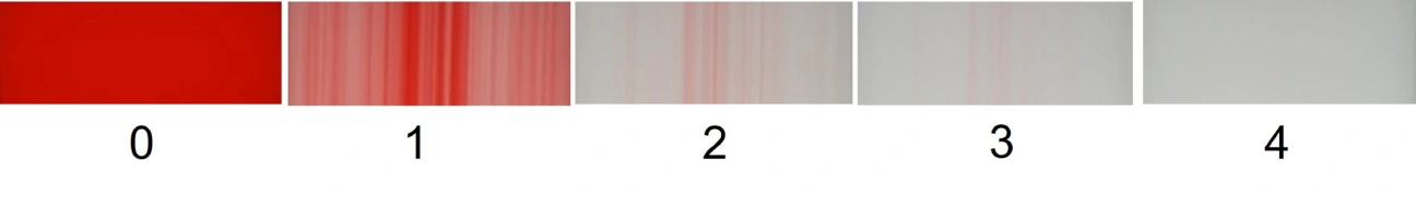 PP film extrusion, color change from red to white; film after 0/1/2/3/4 mixer volumes